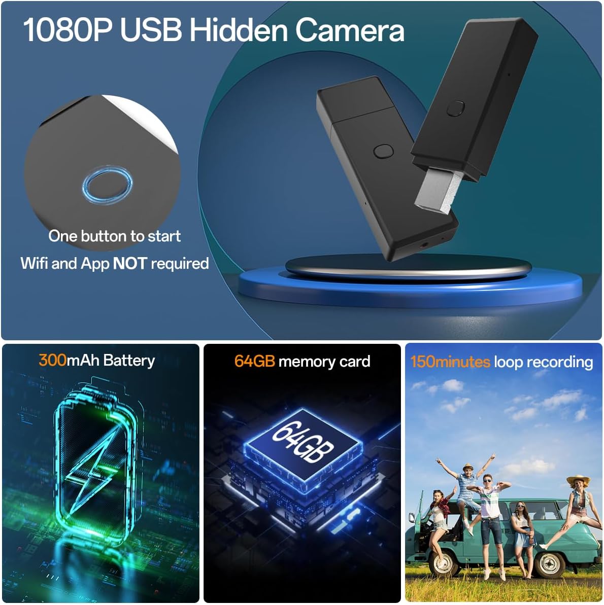 64GB USB Flash Drive Camera,1080P Video Resolution Security, Rechargeable Portable mini Body cam,Surveillance Camera